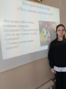 В начале занятия ребята прослушали поучительную историю и сказали, что если налегать на вредную и опасную еду с детства, в организме для полезной просто не останется места! Ученики рассказали, какая еда является опасной, чем она отличается от полезных продуктов питания. Также сыграли в интерактивную игру «Чем опасна вкусная еда?» и говорили, что вредно, а что реально опасно. Ученики определяли, что относится к быстрой еде, что относится к просроченным продуктам, химии, добавкам.
