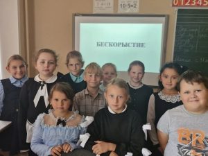 Началось занятие с фразы писателя К. Щемелинина «Настоящее добро бескорыстно». Ребята назвали корень этого слова, назвали положительные и отрицательные качества человека, дали определение слову «бескорыстие».